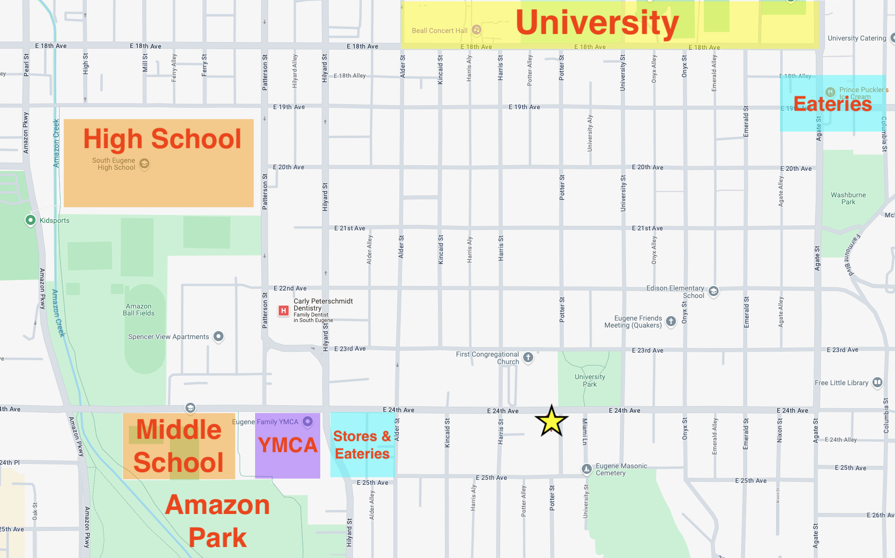 2438 Potter is located six blocks south of the University of Oregon, making it an ideal candidate for housing for students. The site is across the street from University Park, a delightful multi-use public space. It is four blocks from the Sundance Market, several restaurants and shops, and the Eugene YMCA. It is 5 blocks from Roosevelt Middle School, South Eugene High School and Amazon Park.